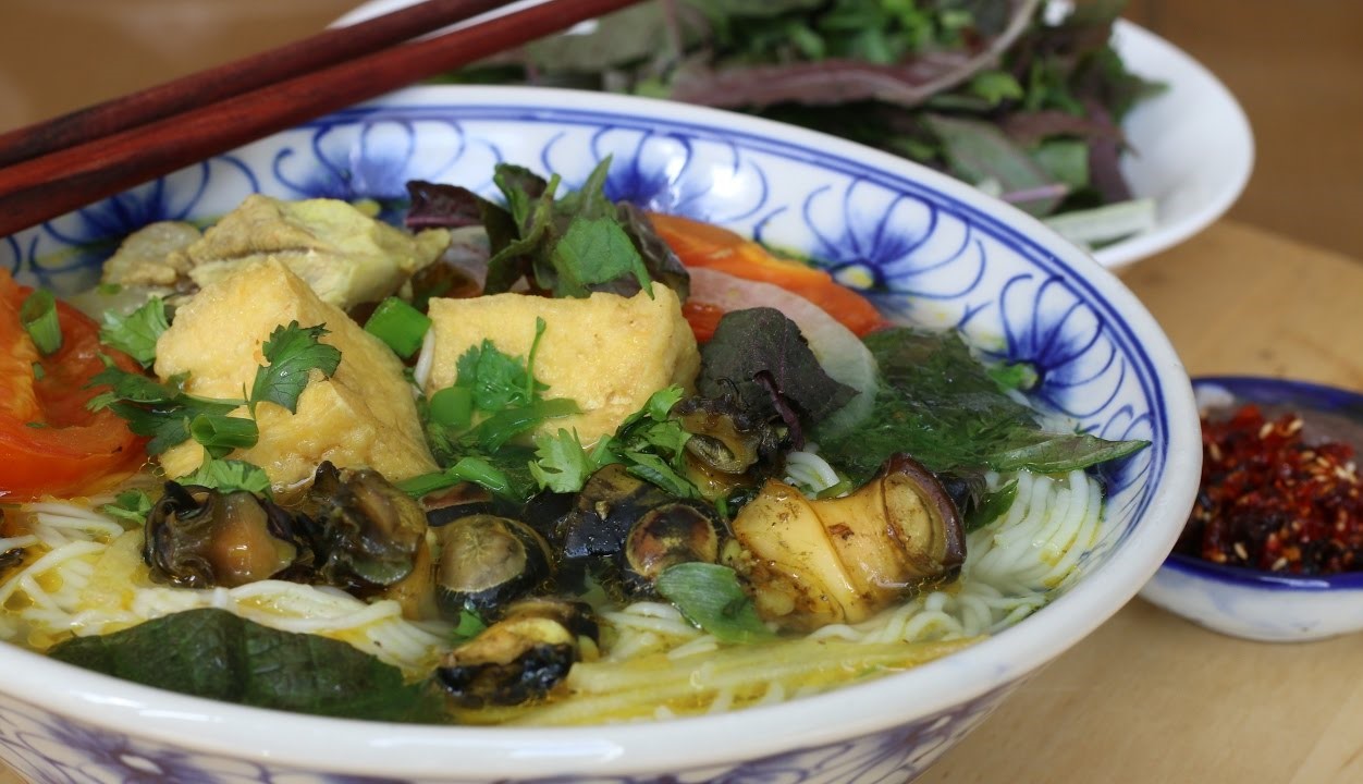 В супе вы найдете рисовую лапшу, кусочки тофу, иногда свиные ушки или кровяную колбаску. Подают его с тарелкой свежей зелени: базиликом, банановым цветом, листьями горчицы. Перед едой в суп часто добавляют немного ферментированной креветочной пасты для усиления вкуса. Это сытное и ароматное блюдо, популярное как на севере, так и на юге Вьетнама.