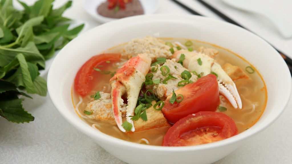 Этот суп отличается насыщенным вкусом и сложной текстурой. Его основа — кисло-сладкий бульон из помидоров и краба, который придает блюду характерный красноватый оттенок. Главная особенность — крабовые фрикадельки (риеу), приготовленные из измельченного крабового мяса или пресноводных раков.